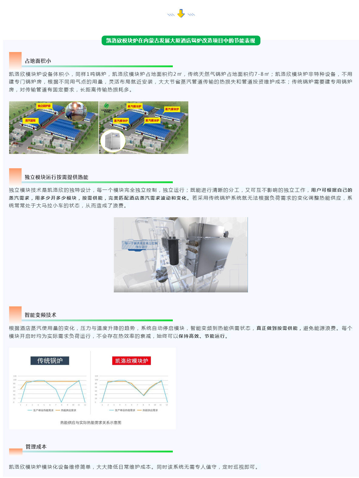 酒店熱能費用是酒店主要成本之一,酒店管理者都在想方設法地降低熱能使用綜合成本,提升盈利能力。近年來,越來越多的酒店選擇凱洛欣模塊爐替代高污染高能耗的傳統鍋爐,不但滿足了環保要求,而且實現了良好的經濟社會效益。